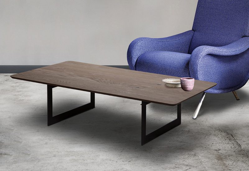 Minimal τραπεζάκι σαλονιού με μεταλλικά πόδια και δρυς ρουστίκ καπάκι.